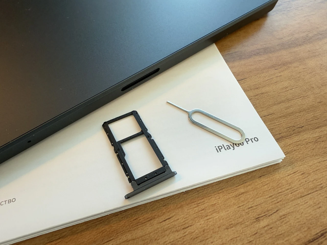 ▼付属のピンでカードスロットを開き、デュアルnanoSIMカードおよび最大1TBまでのマイクロSDカード挿入が可能。