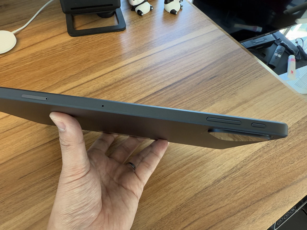筐体は薄型かつスタイリッシュな見た目で、そこそこの高級感も感じられるデザインとなっている。本体重量は約520gとややズッシリ感はあるものの、長時間持ち続けてもそこまで腕が疲れることは無い。