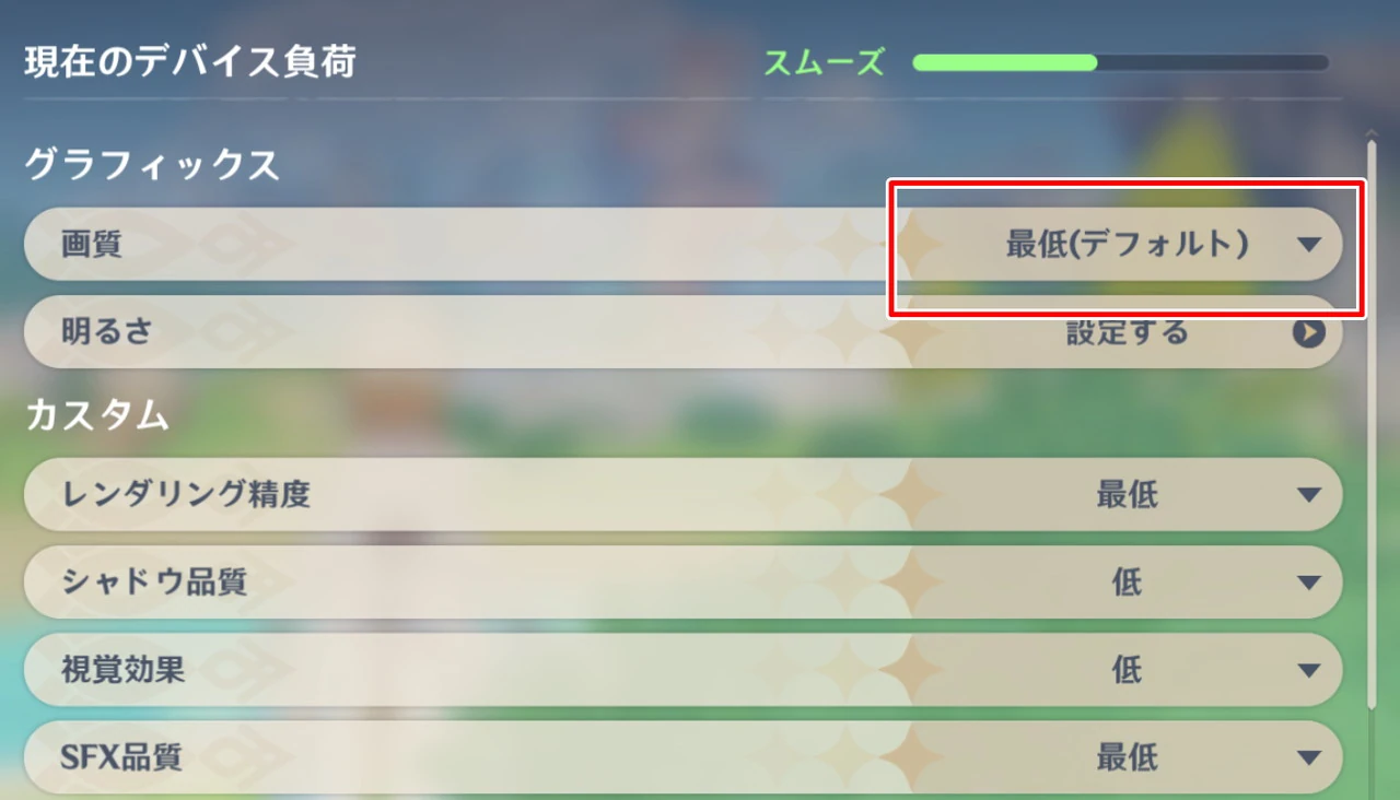 ▼画質設定はデフォルト状態で "最低" に設定されており、デバイス負荷は "スムーズ" の状態。