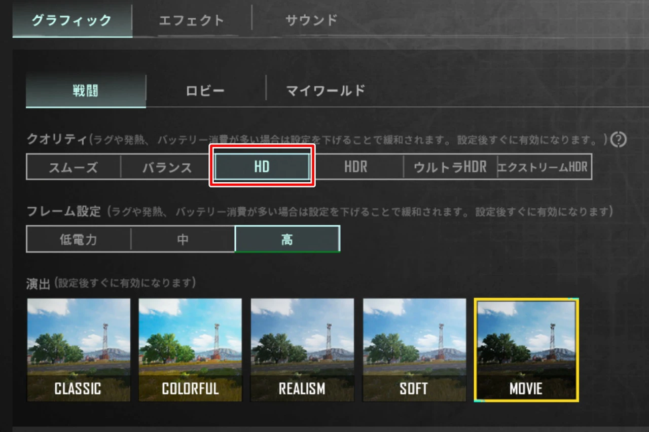 まずグラフィッククオリティに関しては『HD』まで選択できた。