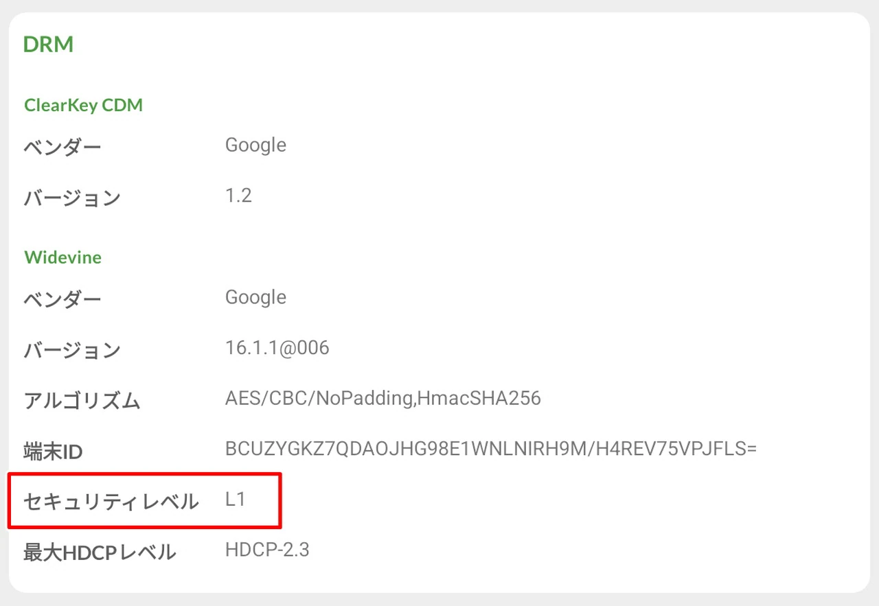 なお、WidevineはL1サポートとなっており、ネットフリックスをはじめ、HuluやAmazonプライムビデオなどの配信サービスにおいて、高画質設定の映像を楽しむことが可能だ。