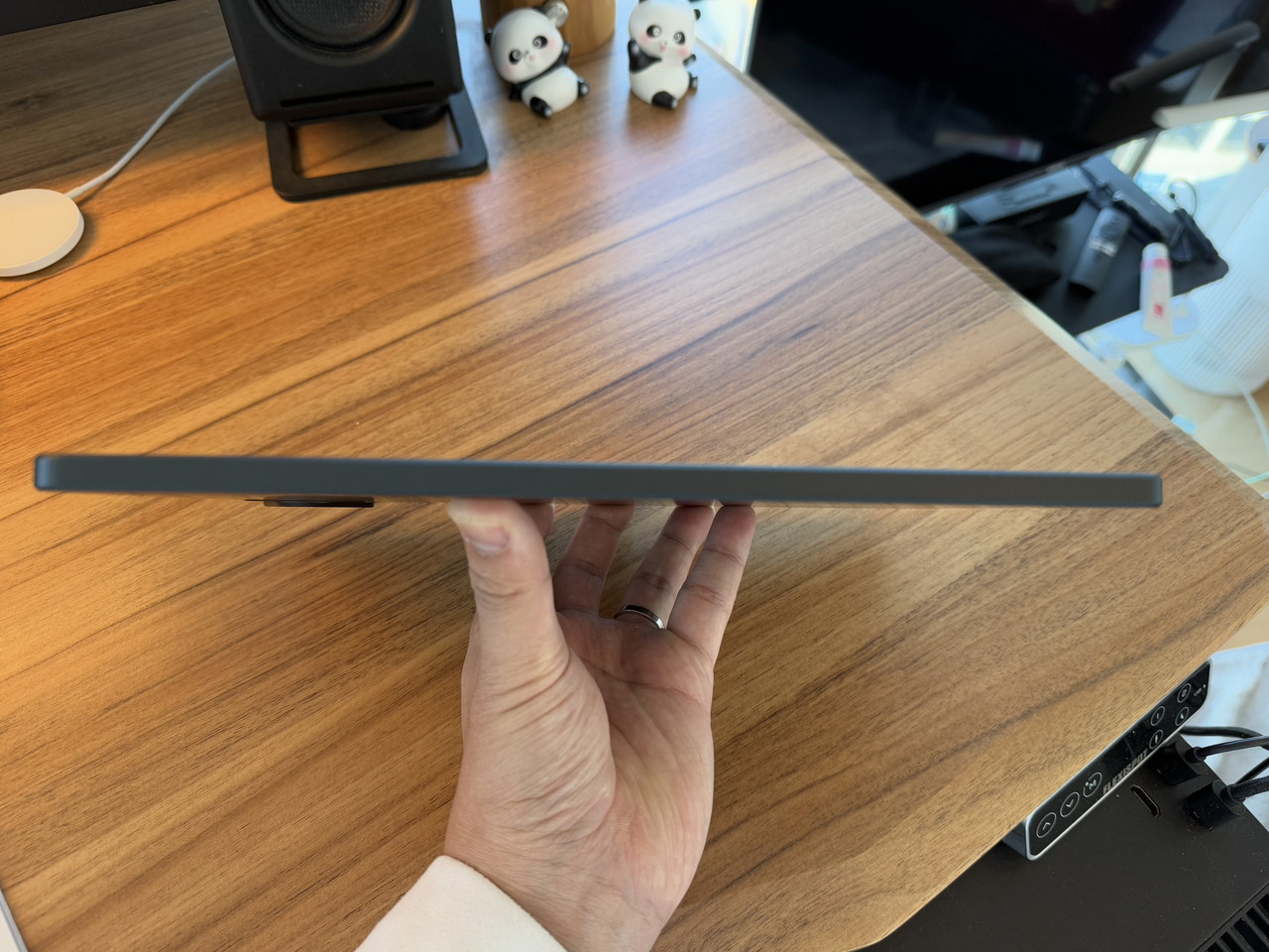 筐体は薄型かつスタイリッシュな見た目で、そこそこの高級感も感じられるデザインとなっている。本体重量は約520gとややズッシリ感はあるものの、長時間持ち続けてもそこまで腕が疲れることは無い。