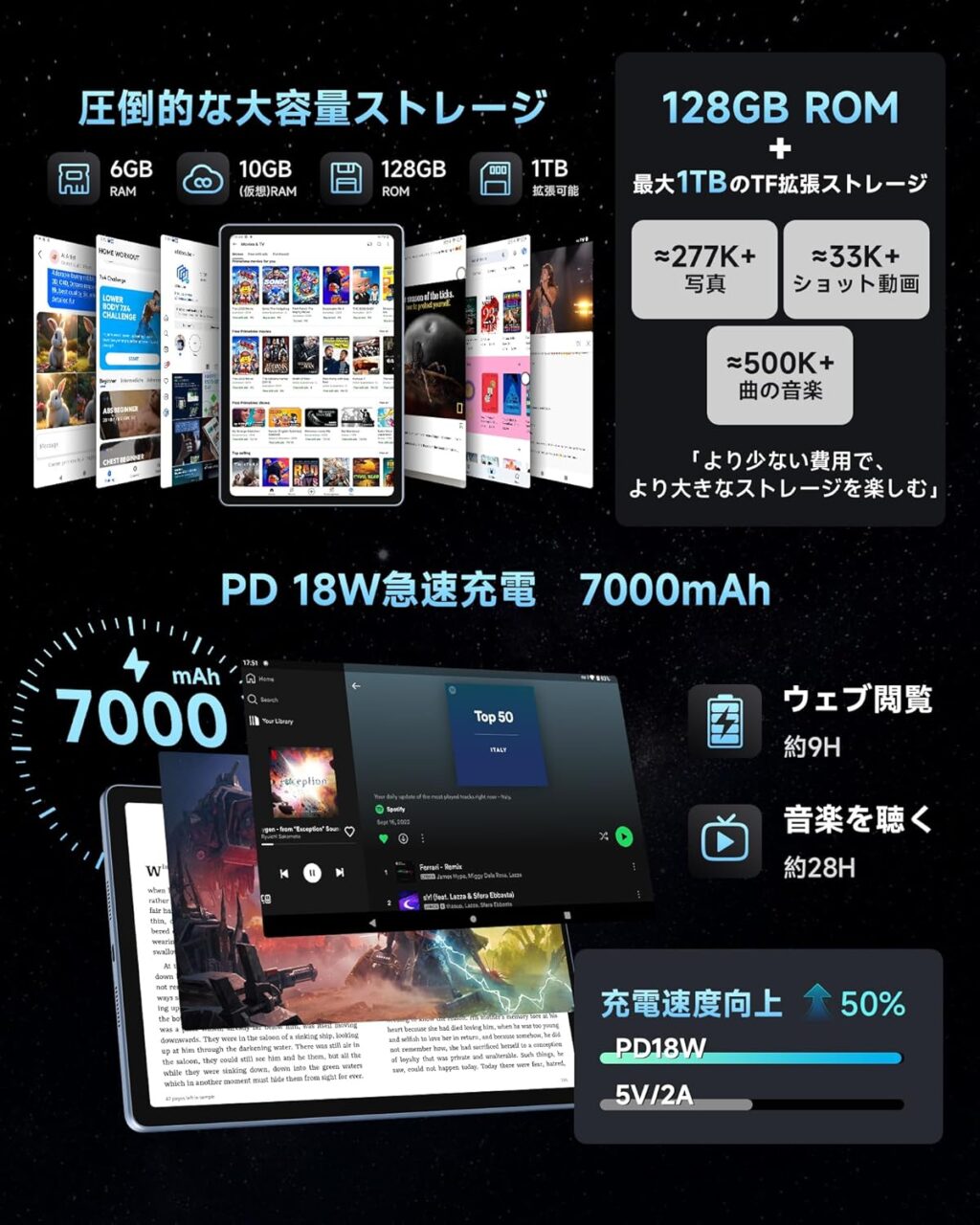 CPU(SoC)には「MediaTek Helio G99 オクタコアプロセッサー」を、RAMは 6GB LPDDR4Xを採用。一般的なタブレット用途は問題なくスムーズにこなせるだけの性能を備えている。最大10GBの仮想RAM拡張が可能で、よりスムーズなタブレット操作を楽しめるようになる。