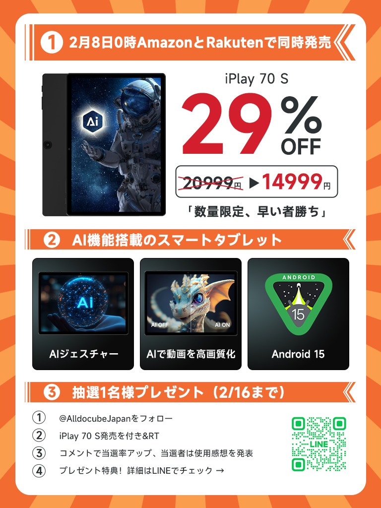 なお、2025年2月16日(日)までの期間限定で、1名に『ALLDOCUBE iPlay 70S』が当たる抽選キャンペーンも開催されます。