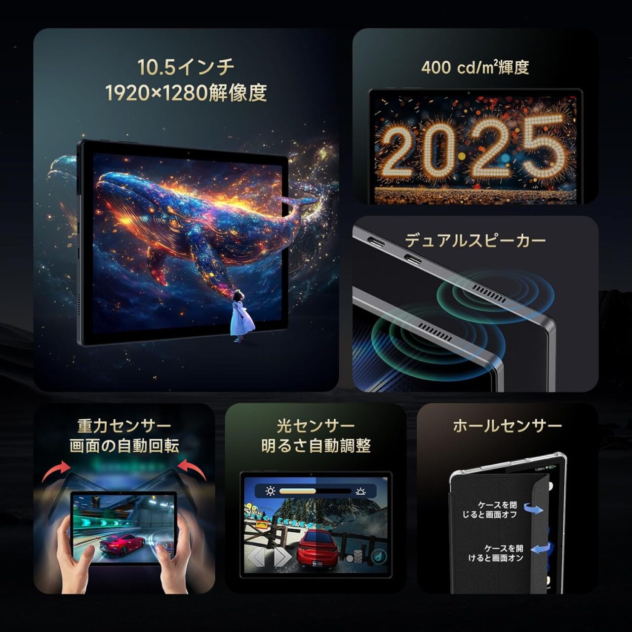 OSには最新Android 15を採用。1920×1280(FHD+)解像度対応の10.5インチIPSディスプレイを搭載。CPU(SoC)には「Allwinner A733MX-N3X オクタコアプロセッサー」を搭載するなど、リーズナブルな価格でそこそこ実用的なスペック構成を備えたエントリーモデルとなっています。