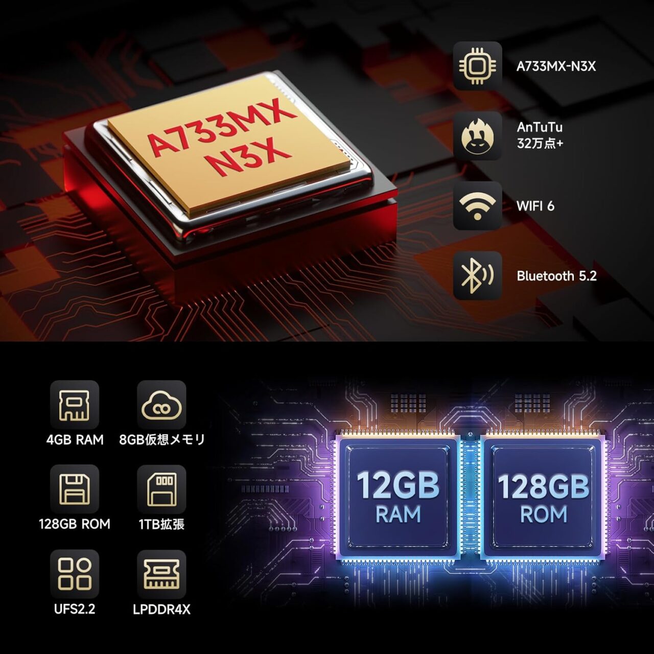 CPU(SoC)には、今やエントリーモデルに搭載されるのが一般的となってきた「Allwinner A733MX-N3X オクタコアプロセッサー」を採用し、4GB LPDDR4X RAM + 128GB UFS2.2ストレージを内蔵。