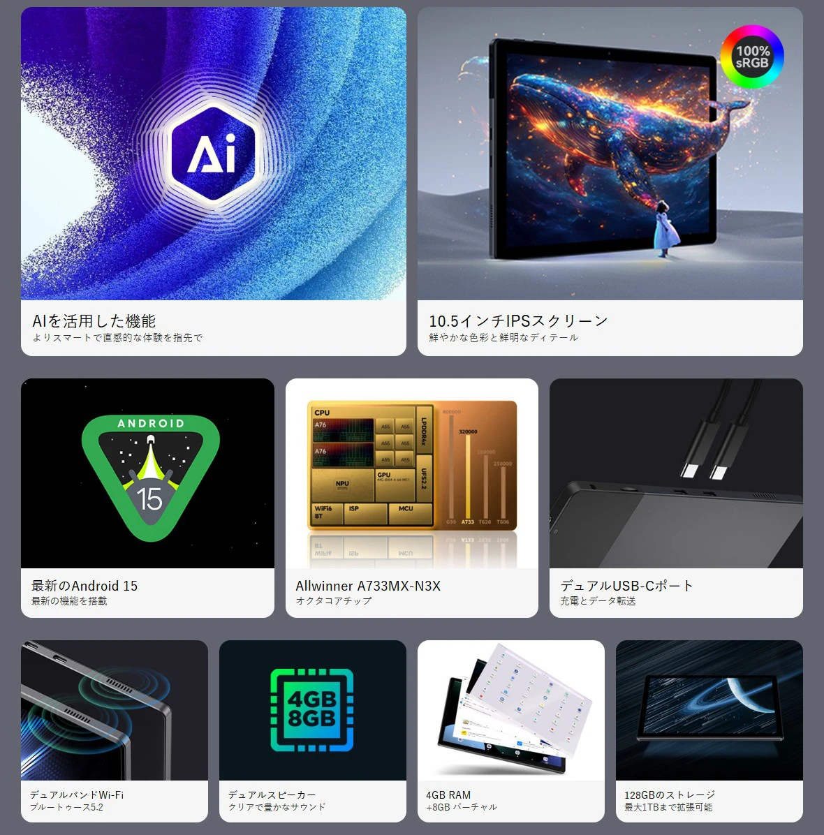 OSには最新Android 15を採用。1920×1280(FHD+)解像度対応の10.5インチIPSディスプレイを搭載。CPU(SoC)には「Allwinner A733MX-N3X オクタコアプロセッサー」を搭載するなど、リーズナブルな価格でそこそこ実用的なスペック構成を備えたエントリーモデルとなっています。