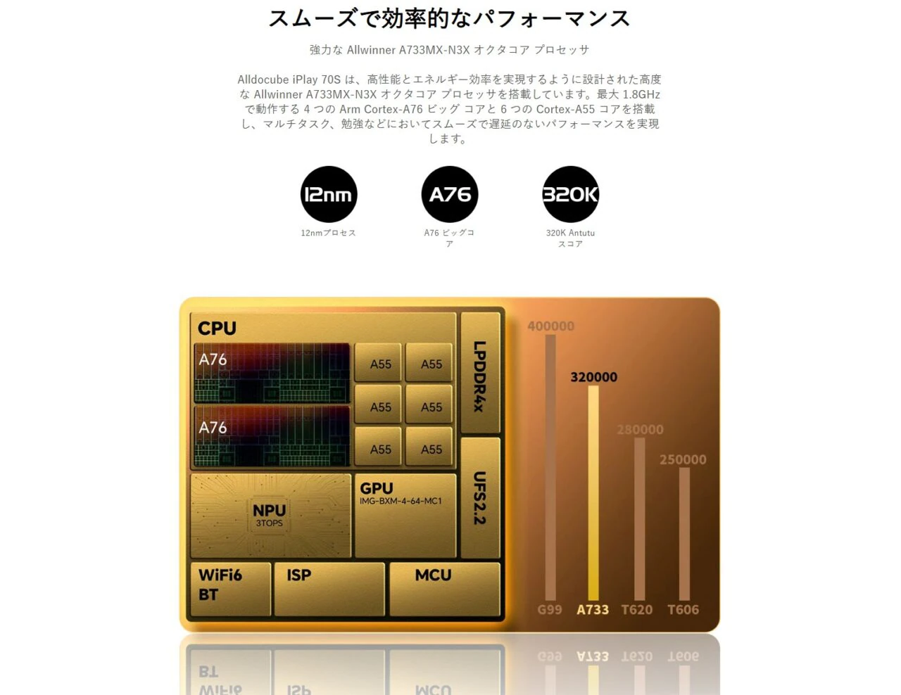 CPU(SoC)には "Allwinner A733MX-N3X オクタコアプロセッサー" を採用しており、AIによるパフォーマンス最適化を実現。公式サイトは約320,000点のAnTuTuベンチマークスコアを謳っています。
