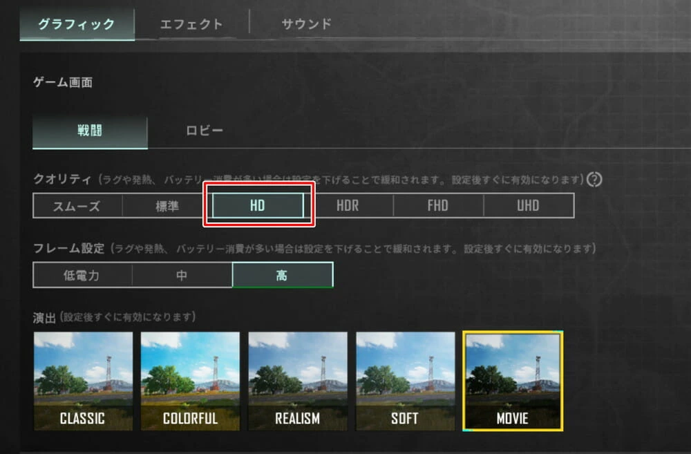 まずグラフィッククオリティに関しては『HD』まで選択出来た。