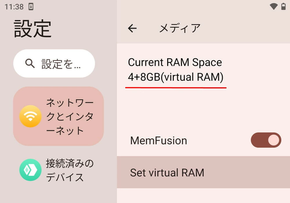 ▼ちなみに、設定アプリより最大12GBまでの仮想RAM拡張が可能だ。