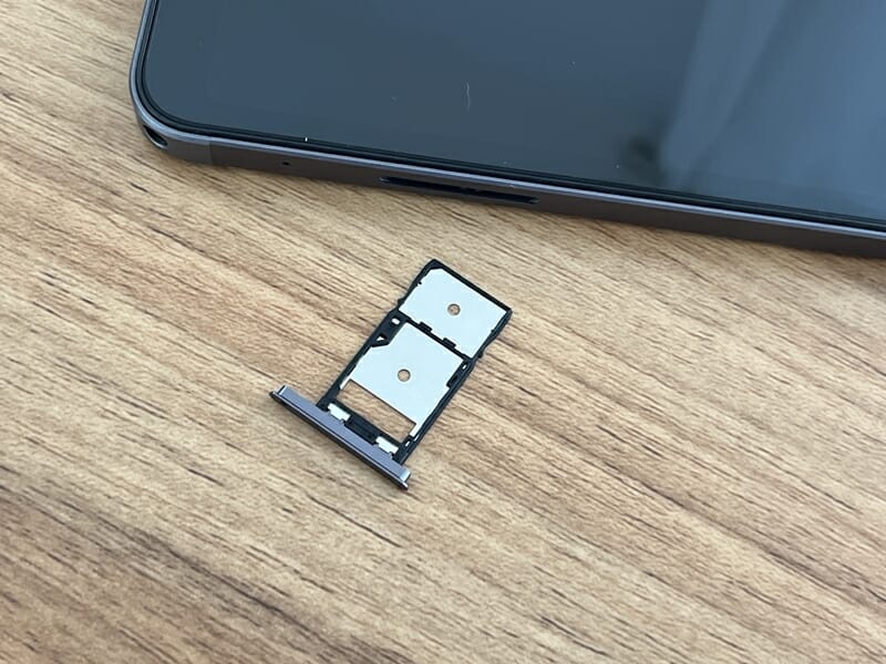 ▼ピンを用いてスロットを開き、マイクロSDカードおよびnanoSIMカードを挿入することが可能だ。