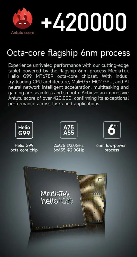 CPUには "Helio G99 オクタコアプロセッサー" を採用しており、8GB RAM(メモリ)を搭載。大抵の作業を快適にこなすことが可能だ。