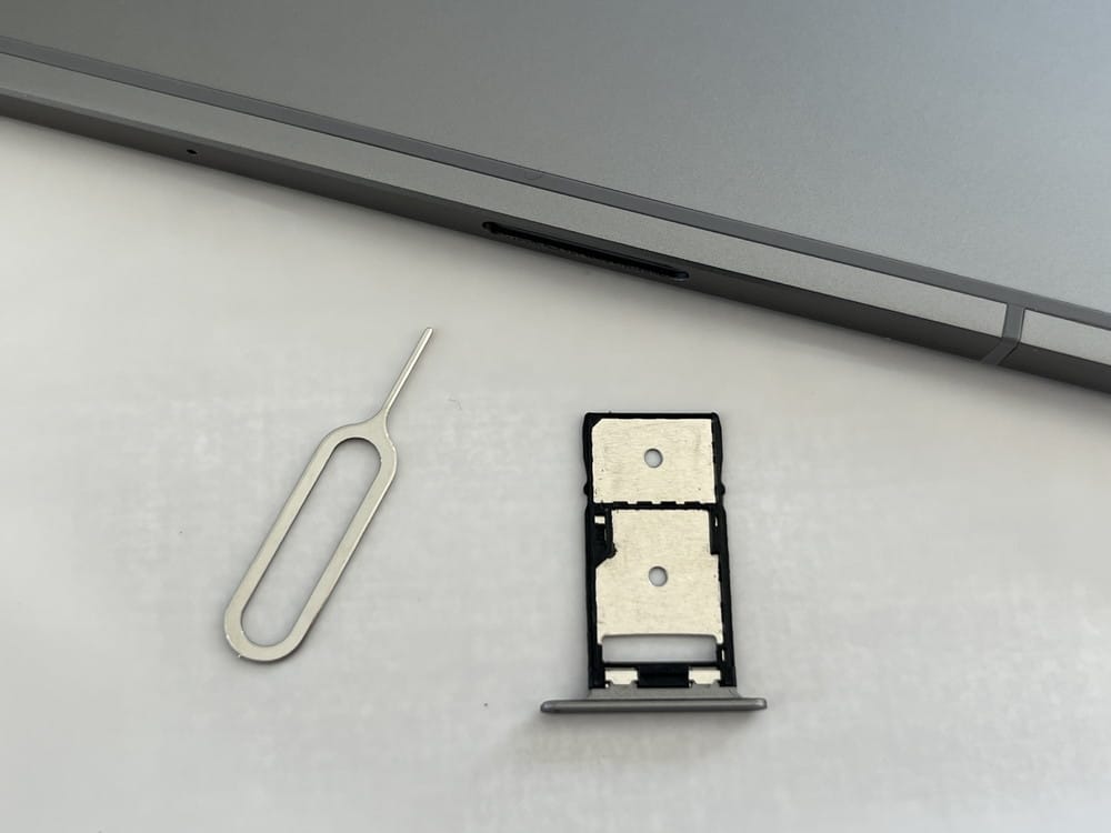 ▼付属のピンでスロットを開き、デュアルnanoSIMカードもしくはマイクロSDカードの挿入が可能。