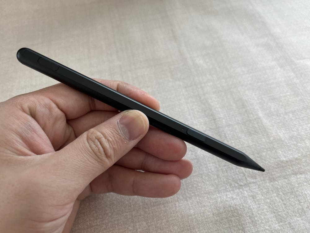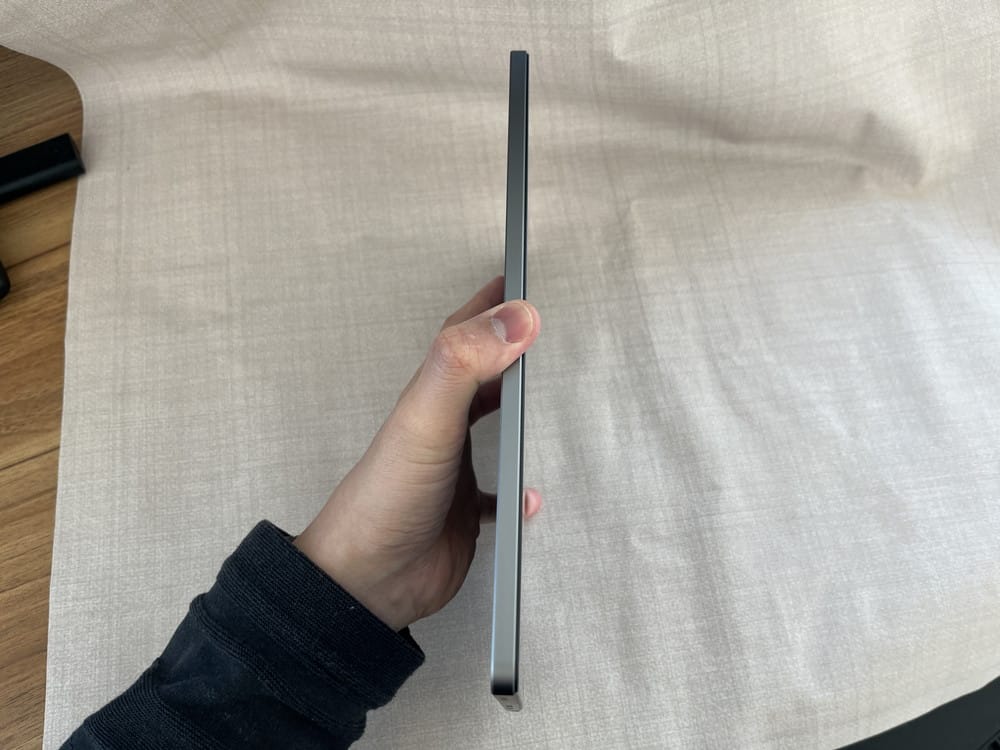 筐体は薄型かつスタイリッシュな見た目で、そこそこの高級感も感じられるデザインとなっている。本体重量は約520gとややズッシリ感はあるものの、長時間持ち続けてもそこまで腕が疲れることは無い。