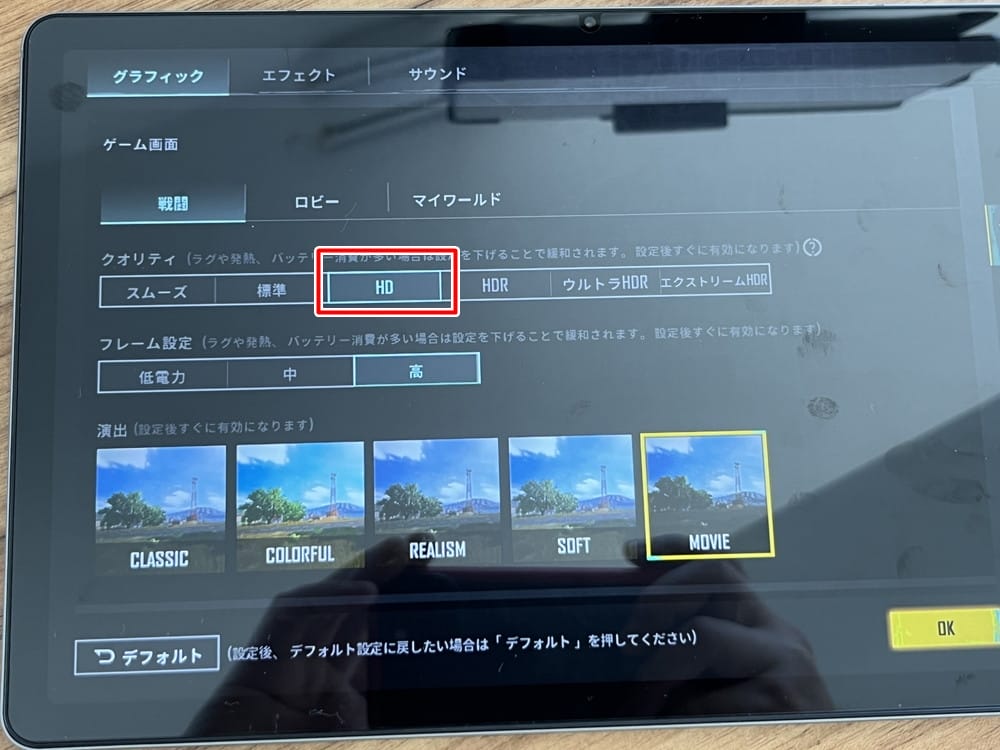 まずグラフィッククオリティに関しては『HD』まで選択できた。