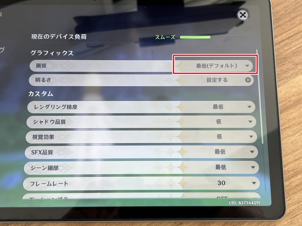 ▼画質設定はデフォルト状態で "最低" に設定されており、デバイス負荷は "スムーズ" の状態。