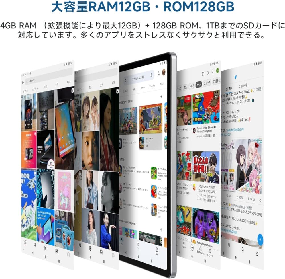 CPU(SoC)にはUNISOC T606 オクタコアプロセッサーを、RAMは4GBを採用。一般的なタブレット用途は問題なくスムーズにこなせるだけの性能を擁している。最大8GBの仮想RAM拡張が可能で、よりスムーズなタブレット操作を楽しめるようになる。