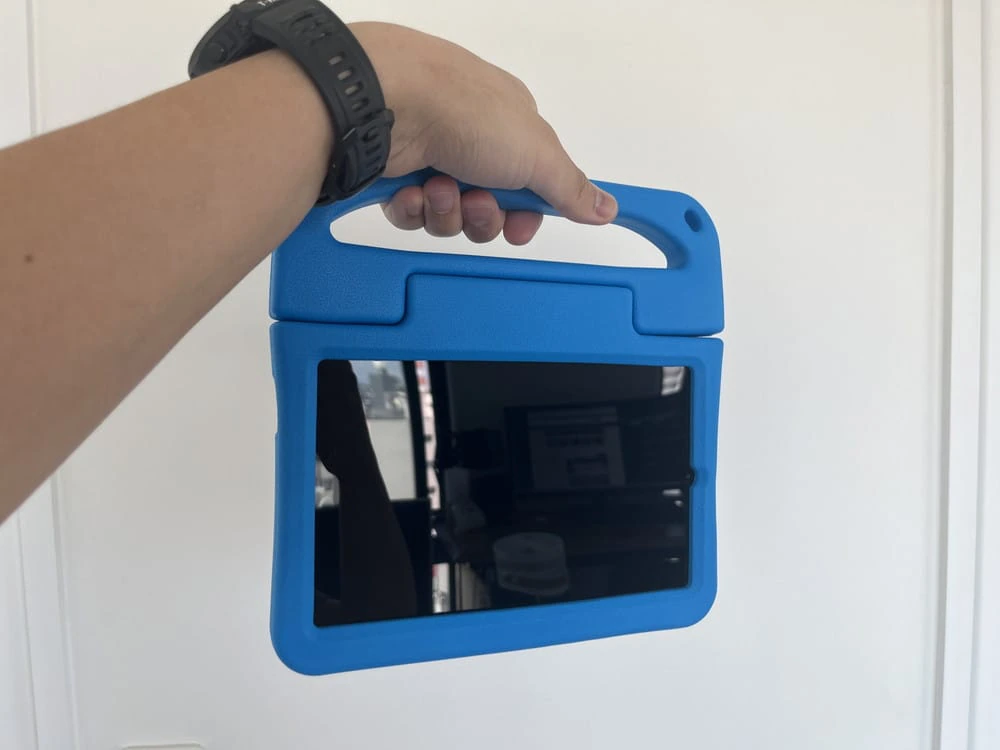 ▼タブレットの外観。8.4インチ型タブレットをシリコン製の保護ケースが包んでいる。