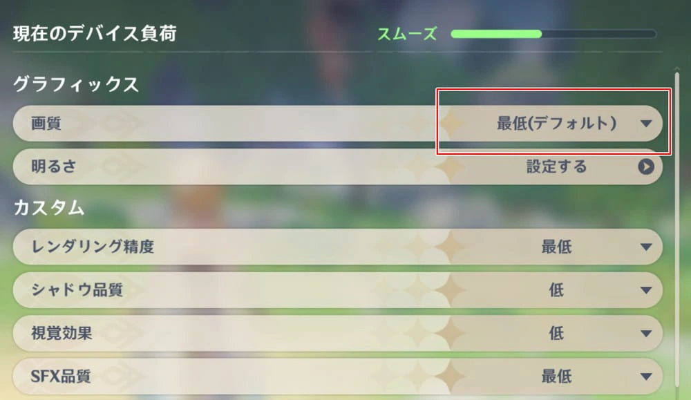 ▼画質設定はデフォルト状態で "最低" に設定されており、デバイス負荷は "スムーズ" の状態。
