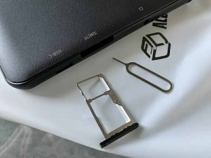 ▼付属のピンを使ってカードスロットを開き、デュアルnano SIMカードやマイクロSDカードを挿入することが可能だ。