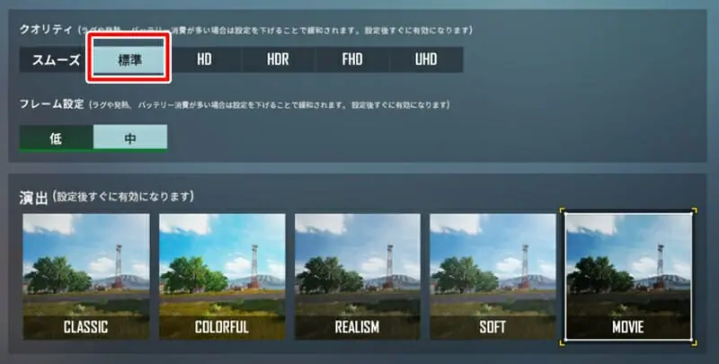 まずグラフィッククオリティに関しては『標準』まで選択出来た。