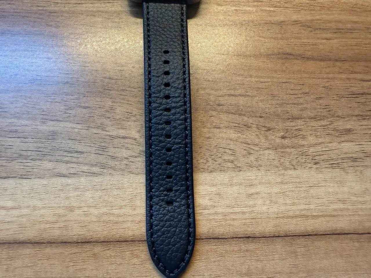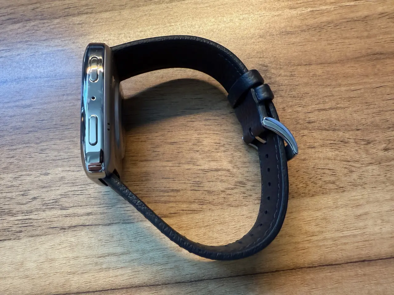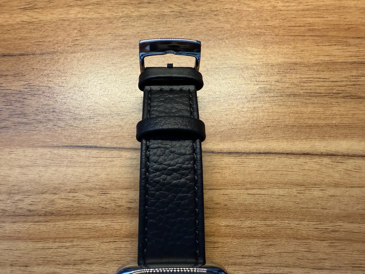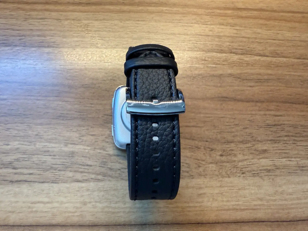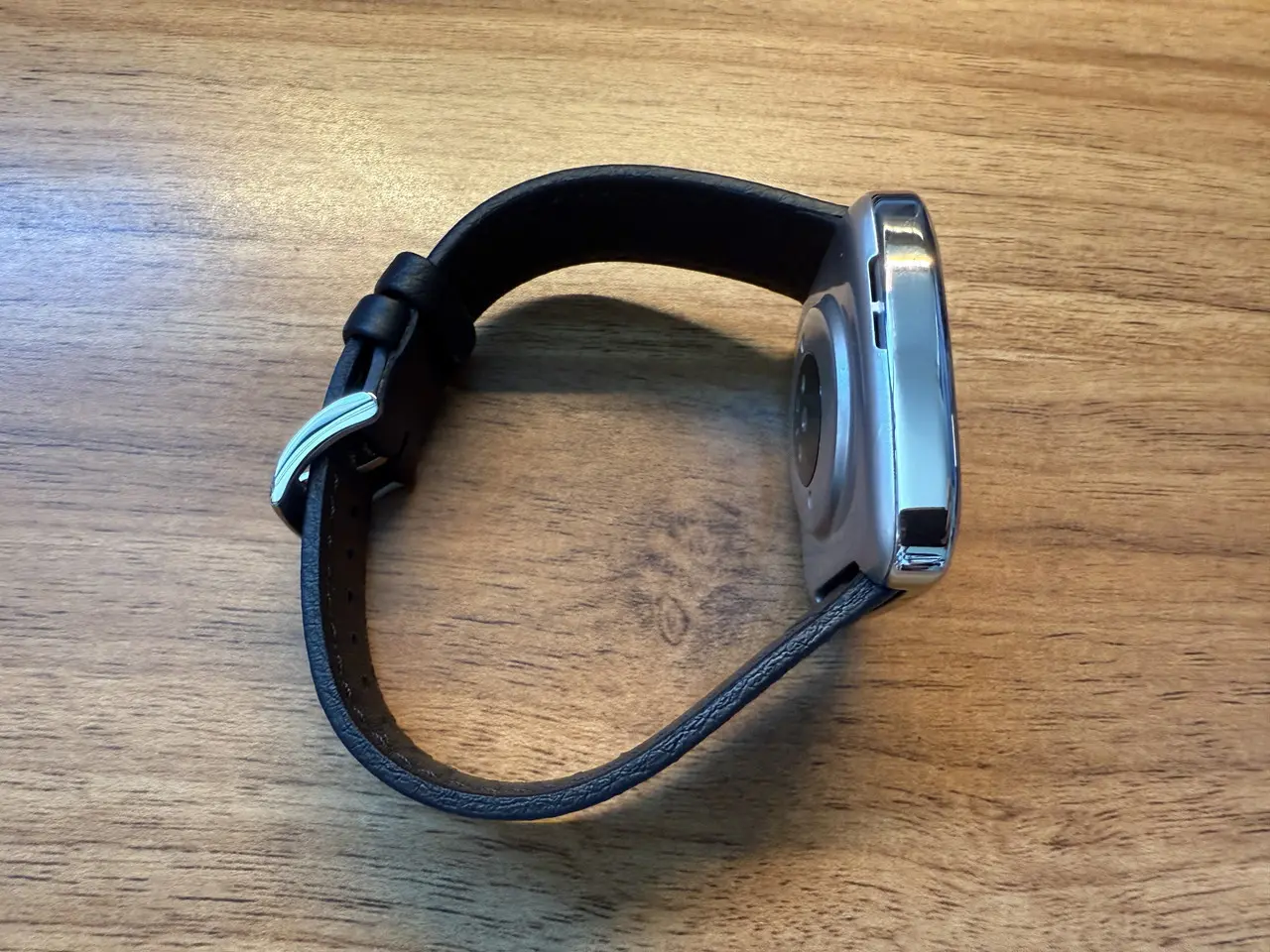 ▼スマートウォッチ本体の外観。開封時点ではブラックレザーバンドが装着されています。