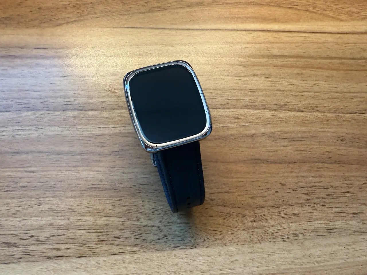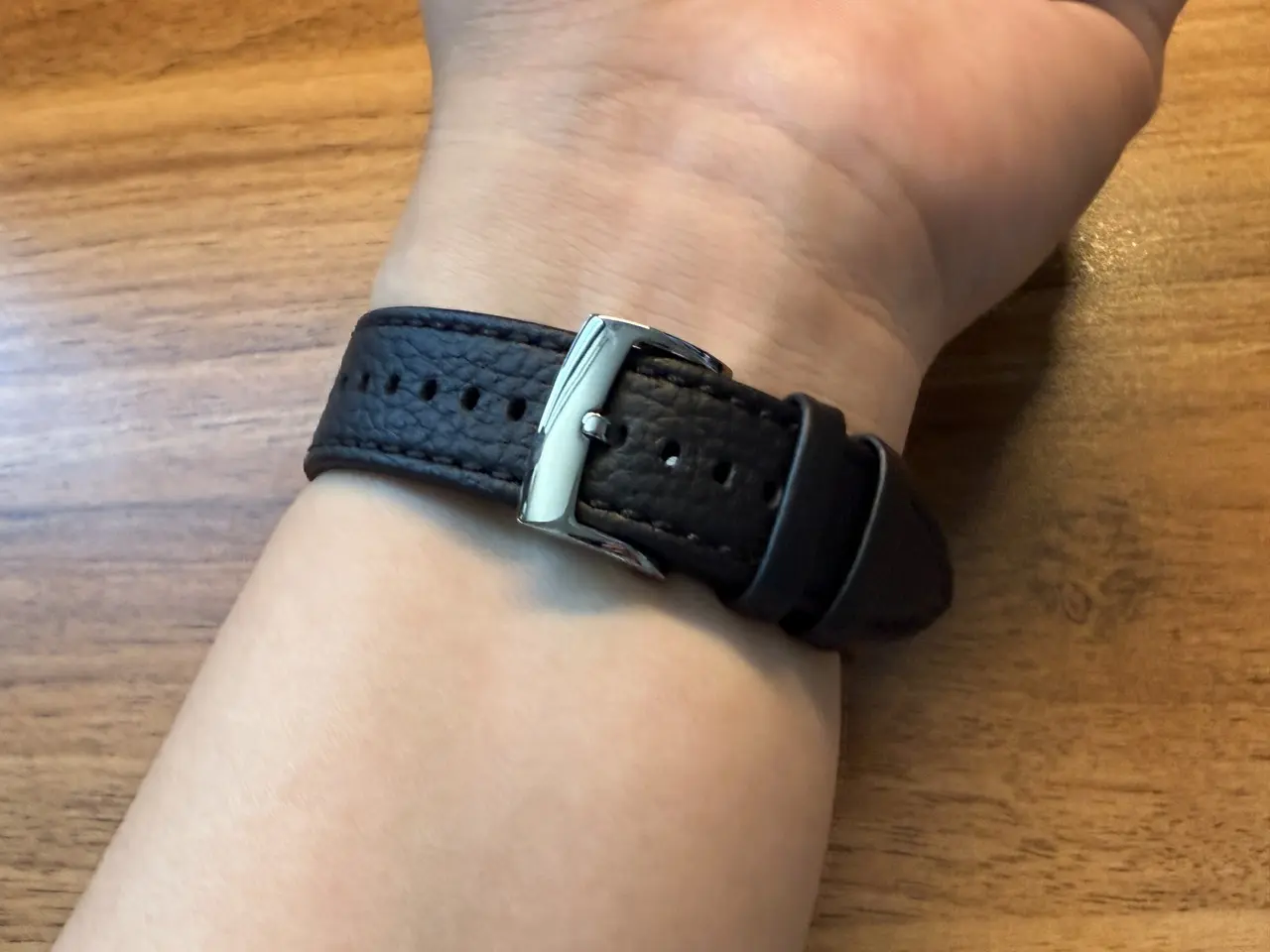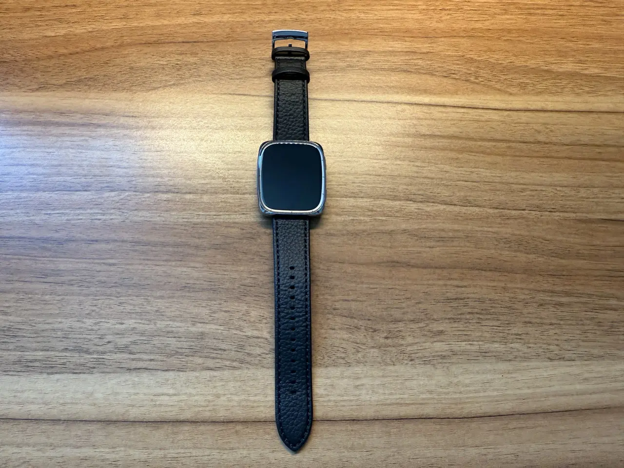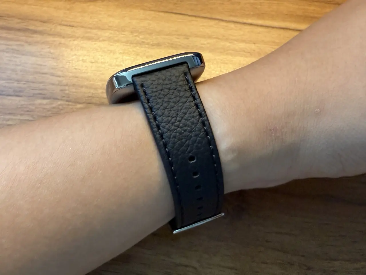 ▼スマートウォッチ本体の外観。開封時点ではブラックレザーバンドが装着されています。