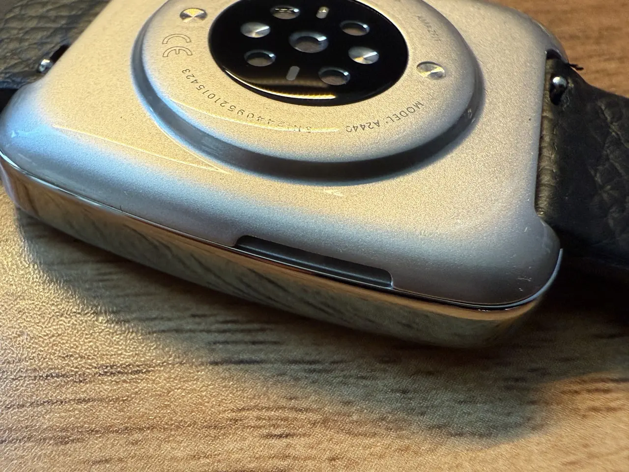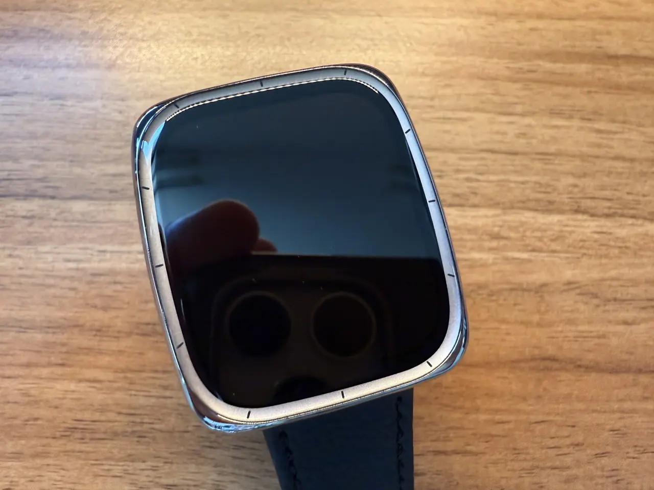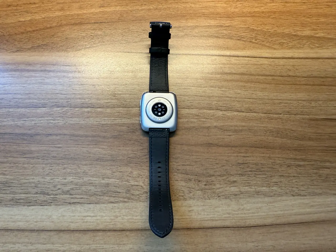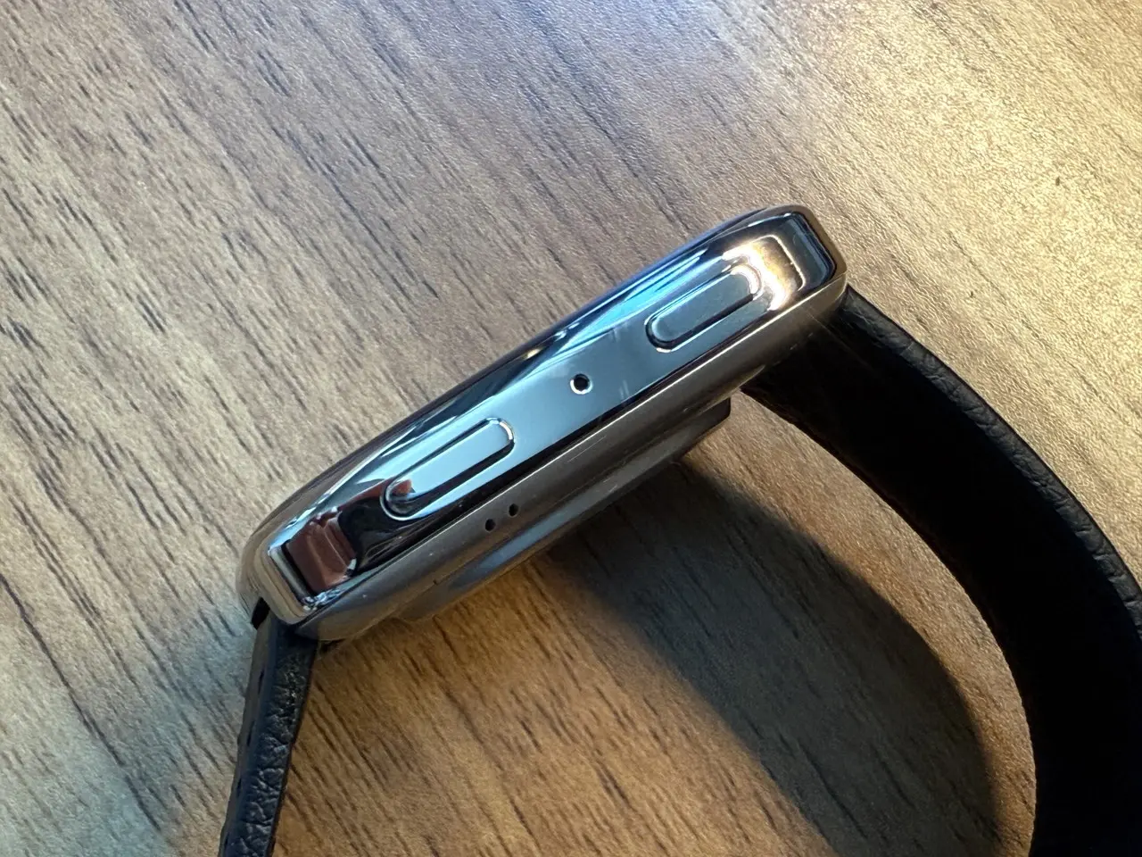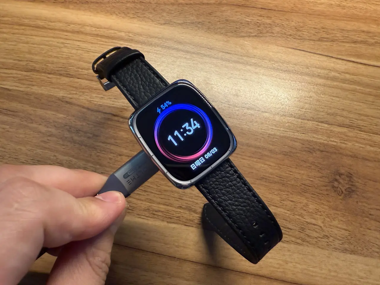▼スマートウォッチ本体の外観。開封時点ではブラックレザーバンドが装着されています。