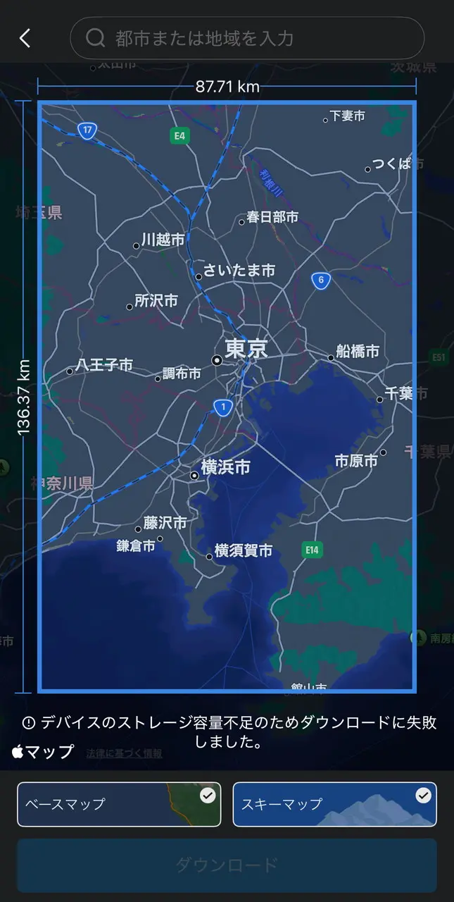 ▼ダウンロードしたい地域をマップ上で枠内に収め、マップ種類をベースマップ・スキーマップの2種類から選択し、ダウンロード。