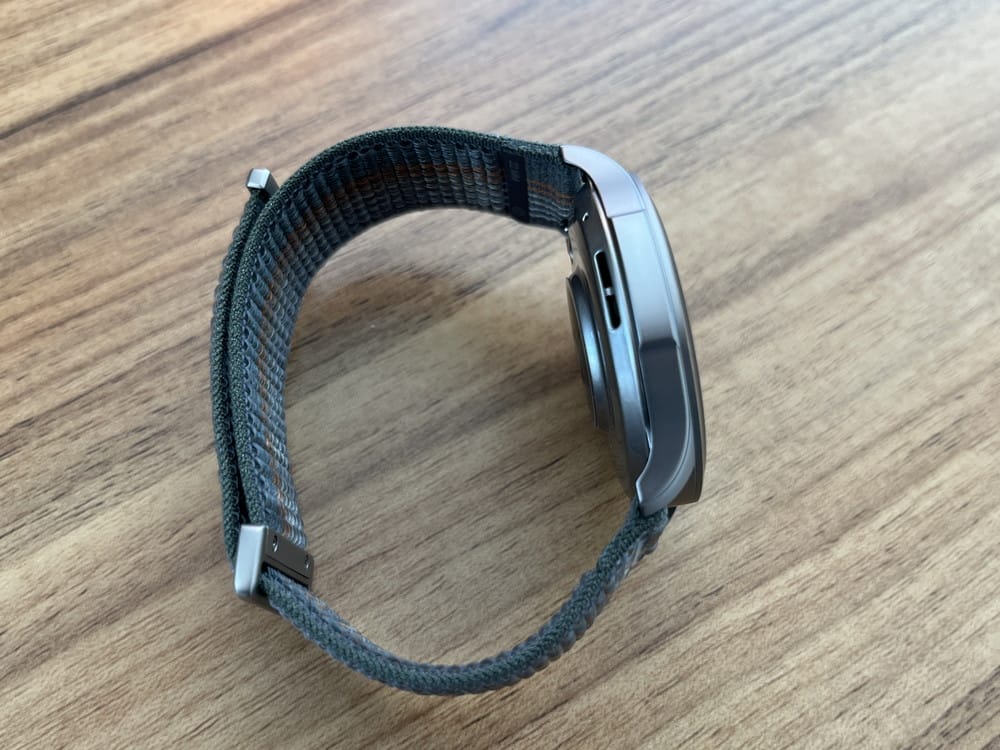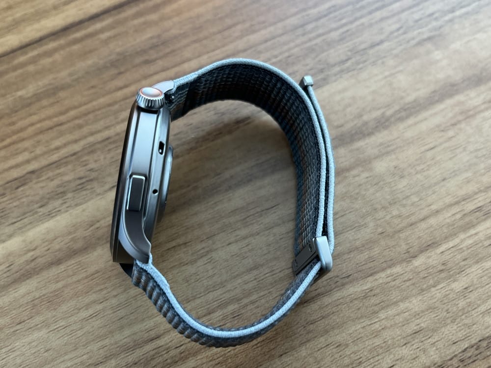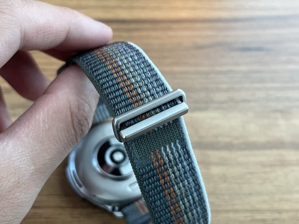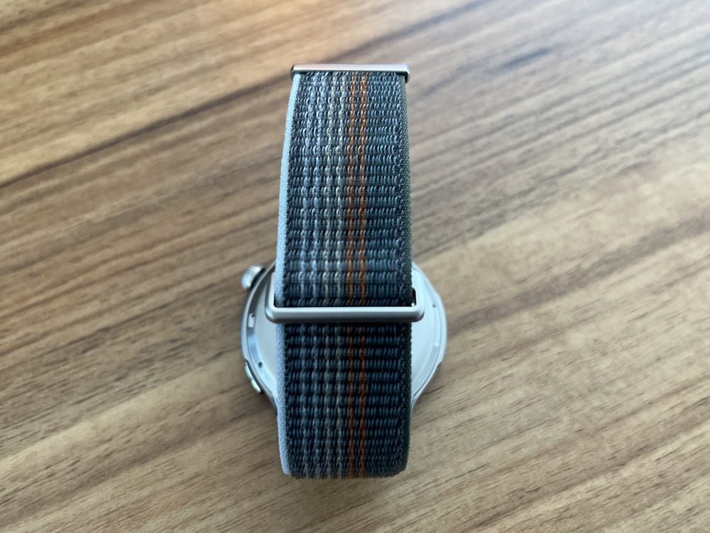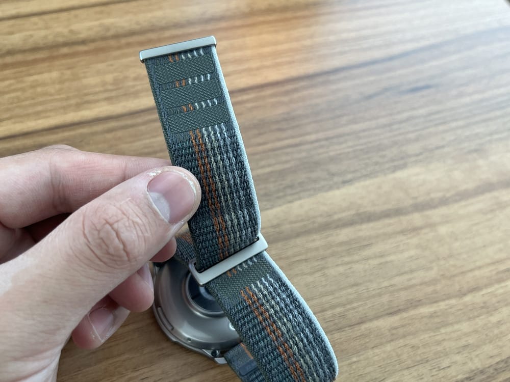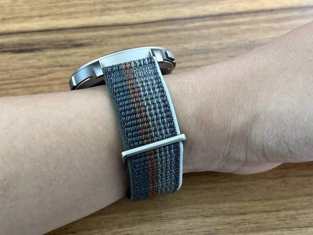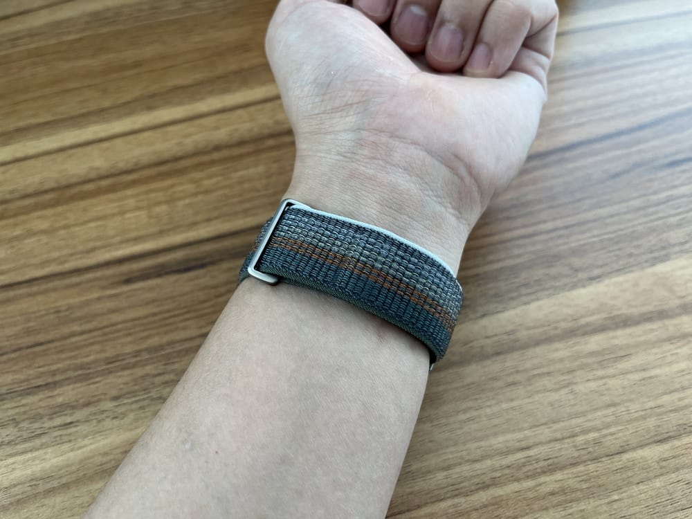 今回レビューしたサンセットグレー色のバンドは、ナイロン製でオシャレな柄のデザインとなっており、ベルクロ式(マジック・テープ)で瞬時に着脱できるうえ、手首の太さに柔軟にフィットする。見た目的にも機能的にも素晴らしいバンドであった。