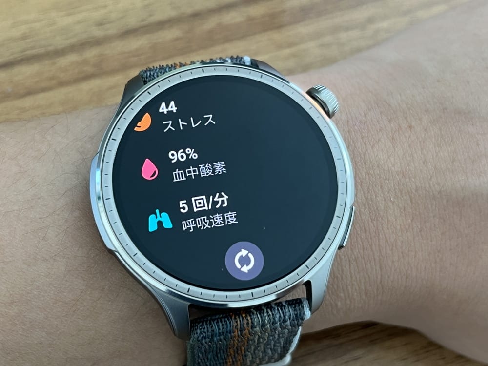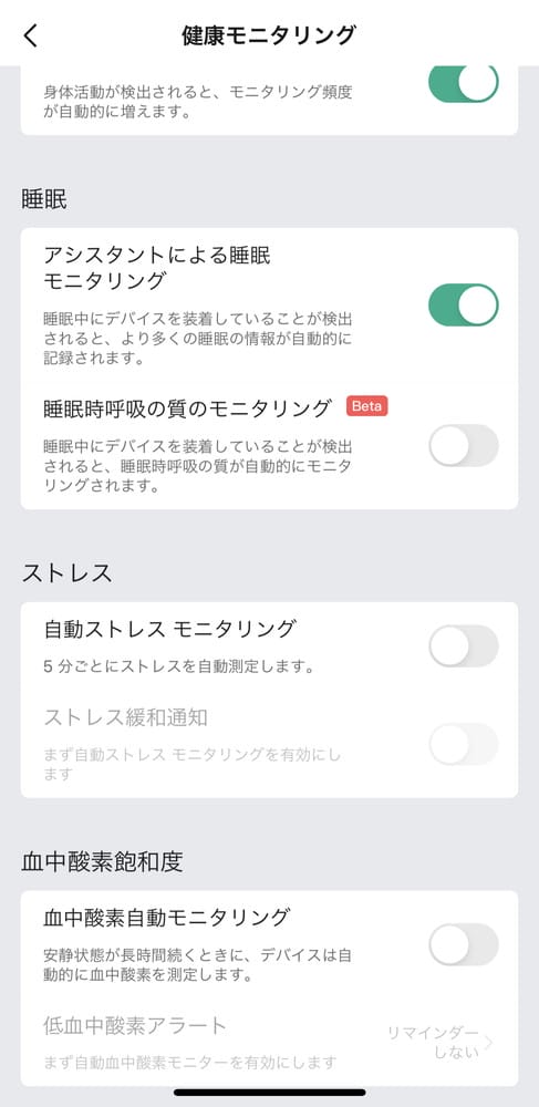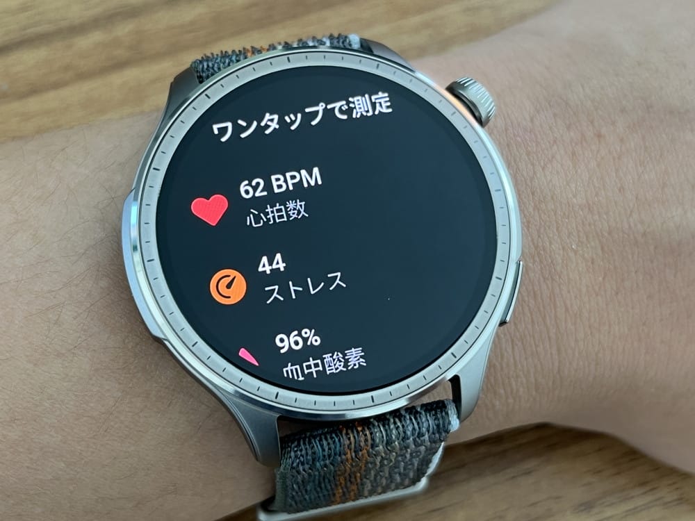 本製品には健康モニタリング機能が備わっており、ストレス・睡眠・心拍数・血中酸素飽和濃度などの数値を24時間監視(トラッキング)し、データとして可視化・保存しておくことが出来る。
