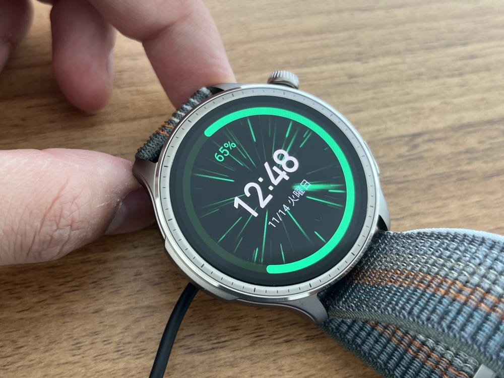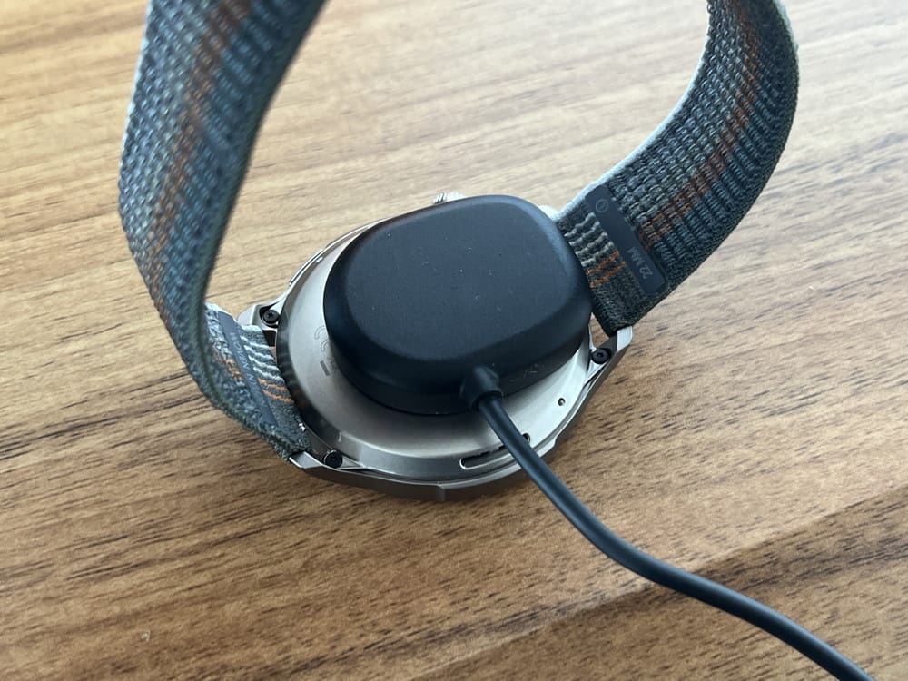 充電の際は、スマートウォッチ背面のポートにケーブル端子を近づけるだけでカチッと磁石で吸着し、充電が開始される。