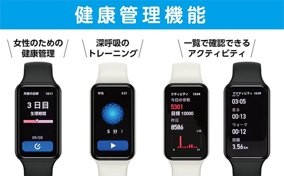 ストレスレベルの計測やアクティビティの確認、女性向きの健康管理機能など、日々の記録に役立つ機能が盛りだくさんです。