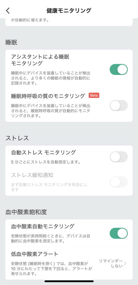 本製品には健康モニタリング機能が備わっており、ストレス・睡眠・心拍数・血中酸素飽和濃度などの数値を24時間監視(トラッキング)し、データとして可視化・保存しておくことが出来る。