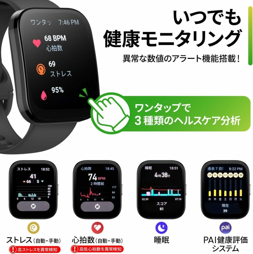 血中酸素測定や睡眠モニタリング機能をはじめとした多くの健康管理ツールが用意されており、普段から自然と健康を意識出来るようになるだろう。何よりZepp OS搭載で、続々と配信される新機能を追加できるため、拡張性にも優れている。