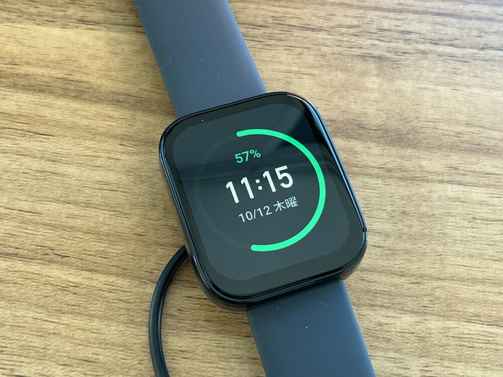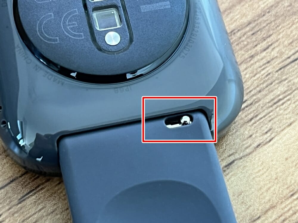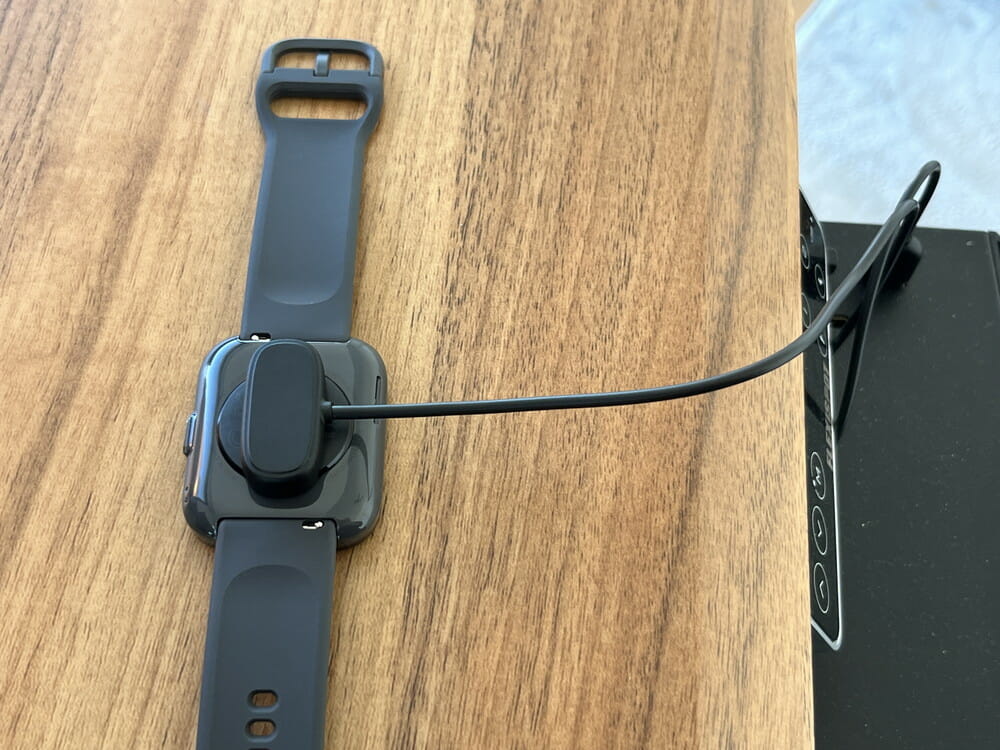 充電の際は、スマートウォッチ背面のポートにケーブル端子を近づけるだけでカチッと磁石で吸着し、充電が開始される。