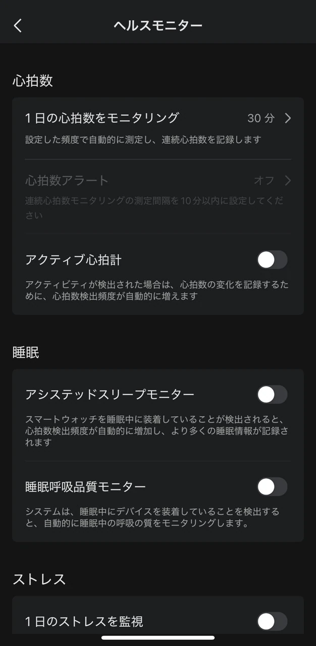 本製品には健康モニタリング機能が備わっており、ストレス・睡眠・心拍数・血中酸素飽和濃度などの数値を24時間監視(トラッキング)し、データとして可視化・保存しておくことが出来る。