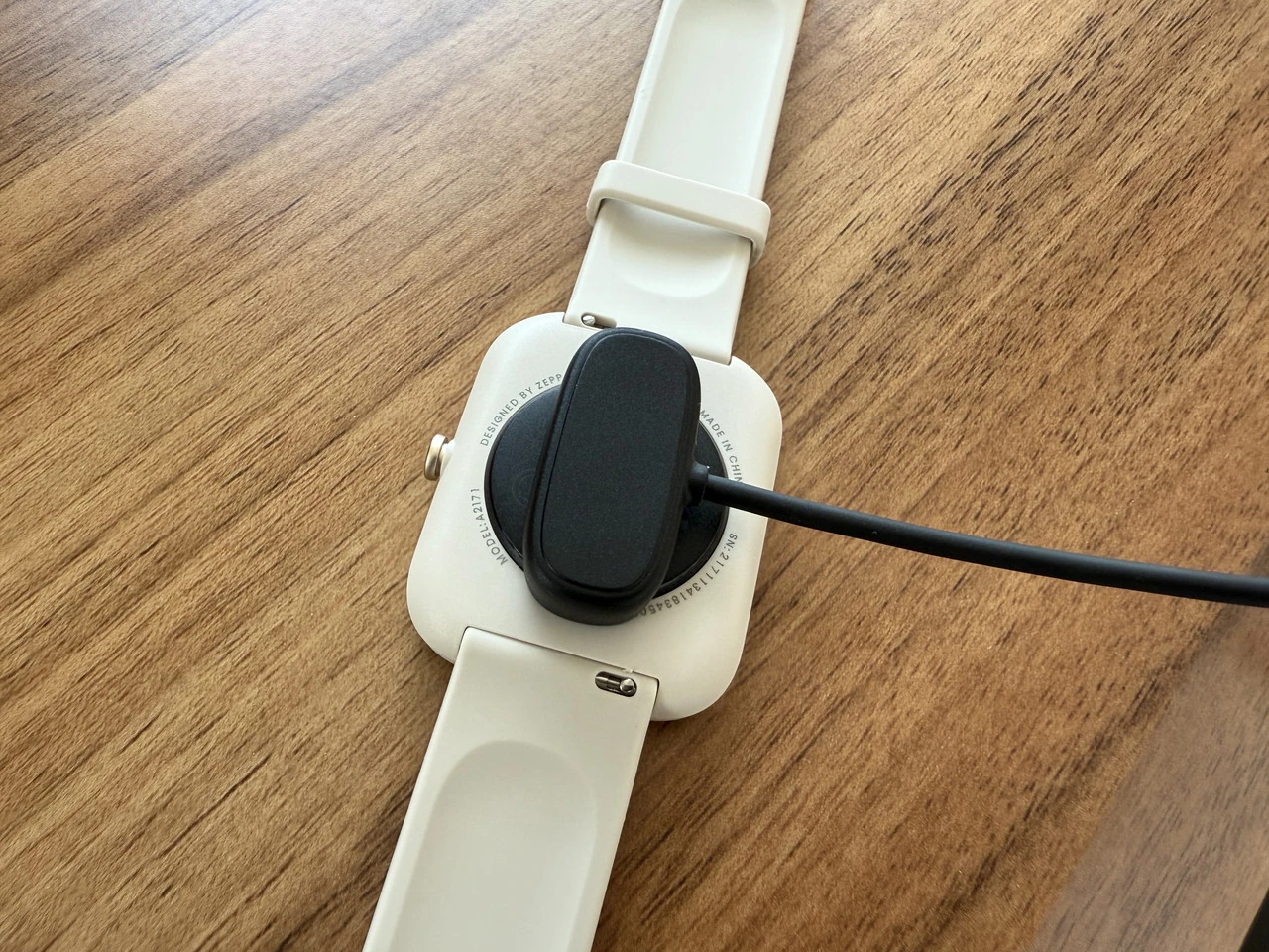 充電の際は、スマートウォッチ背面のポートにケーブル端子を近づけるだけでカチッと磁石で吸着し、充電が開始される。