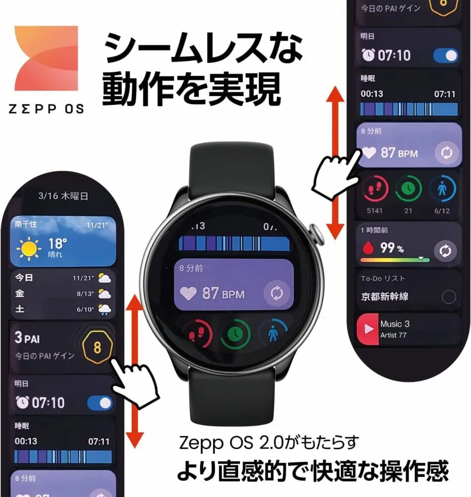 - Zepp OS搭載で非常に充実した機能を利用可能
