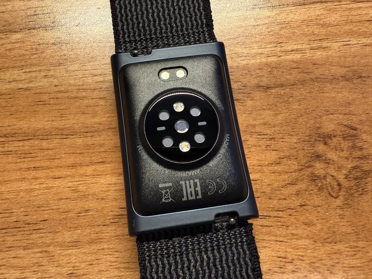 ▼裏面中央には充電用端子と、生体情報を読み取るセンサー類が内蔵。