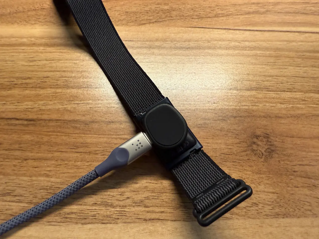 付属の充電アダプタにType-Cケーブル(別売り)を繋ぎ、Amazfit Helio Strap背面に装着することで電源がオンになります。