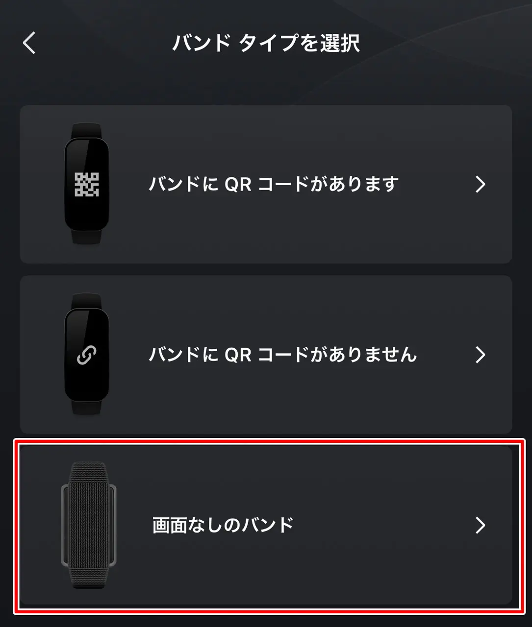 Amazfit Helio Strapの電源がオンになったらアプリを起動し、デバイスの追加画面から「画面なしのバンド」を選択。