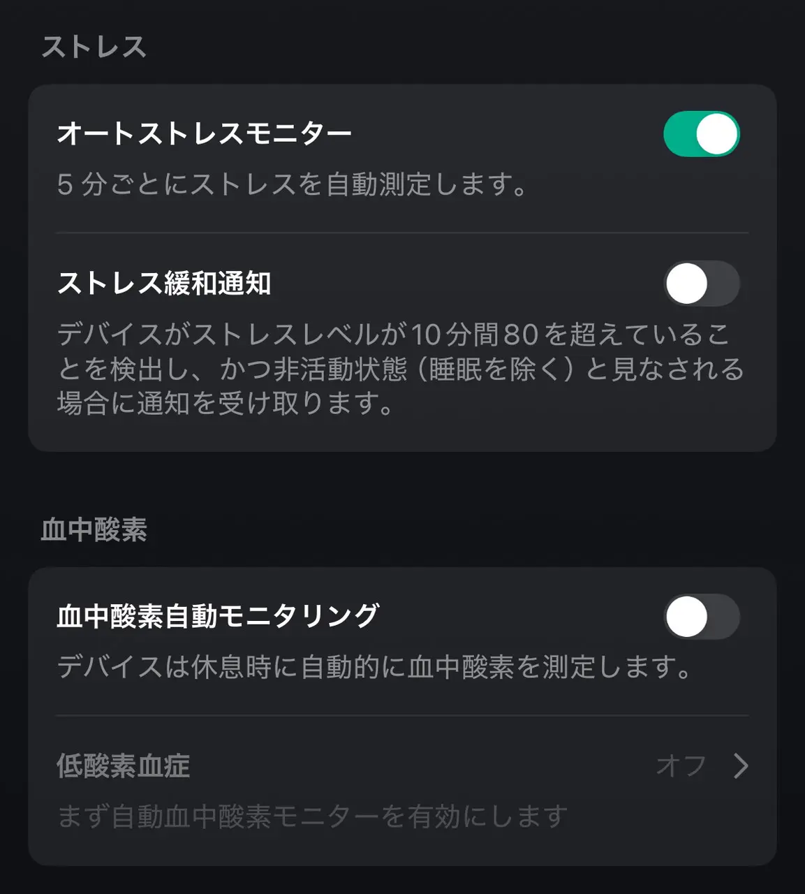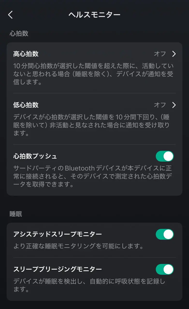 また、ヘルスモニターに関する設定項目に関しては、Amazfit Helio Strapの本格利用開始前に調整・変更しておくことをオススメします。