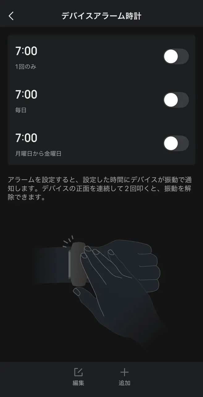 ▼アラーム機能も搭載。設定した時間になるとAmazfit Helio Strapが振動して知らせてくれます。