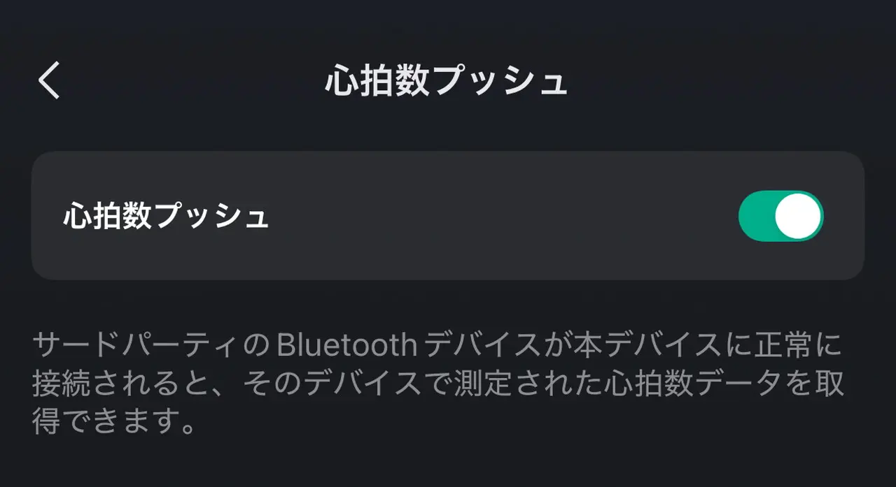 ▼心拍数プッシュをオンにすれば、サードパーティ製アプリやフィットネス機器に、Helio Strapがリアルタイムで測定した心拍数データを送ることができます。