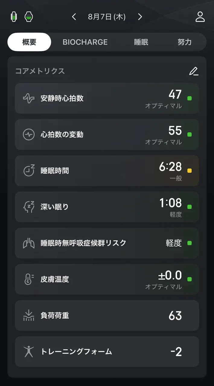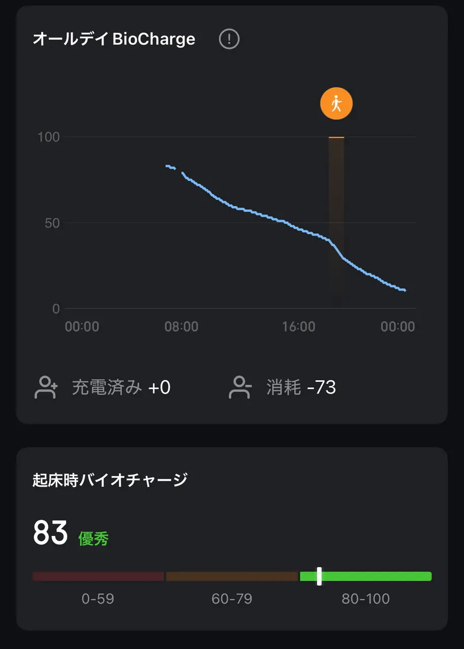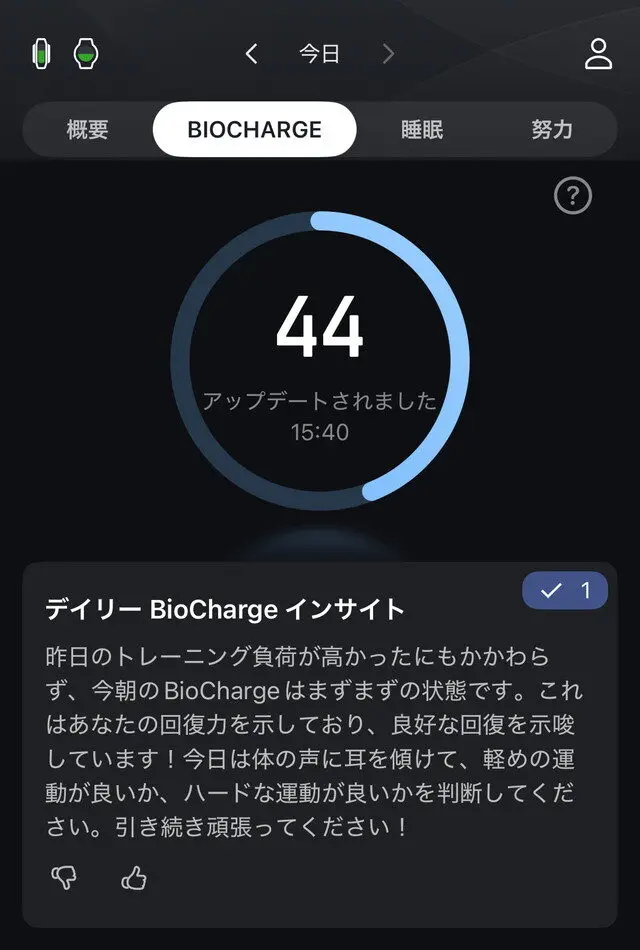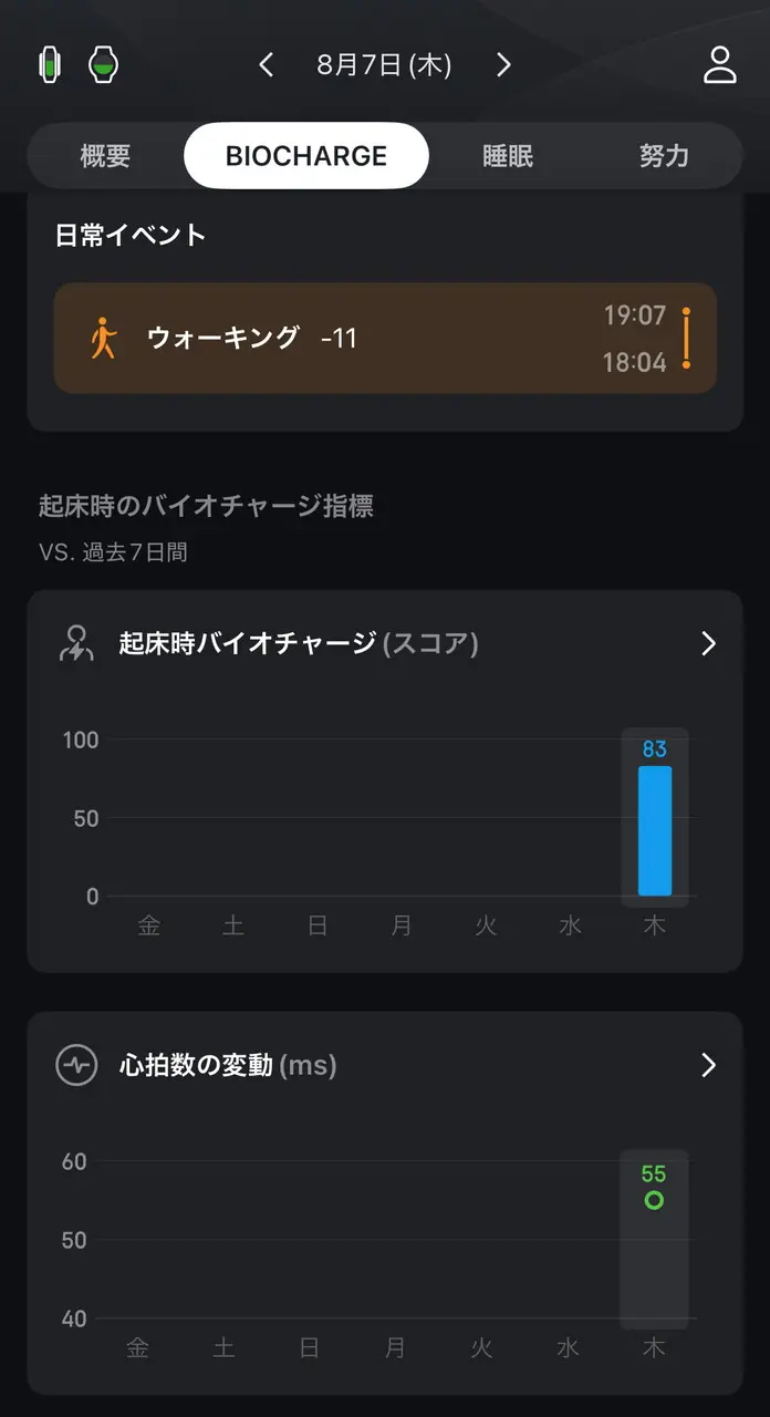 このように、「BioCharge™ エネルギースコア」機能を活用することで、自身のなんとなくの感覚だけでなく、データに基づいて運動・休養のバランスを判断できるため、オーバーワークの防止やトレーニング効率の最適化に役立ちます。
