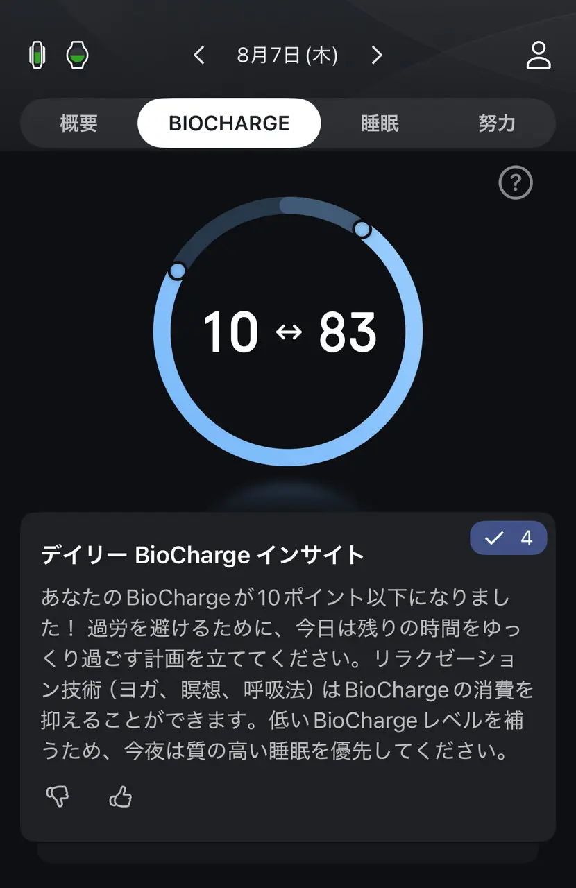 心拍や血中酸素、ストレス、睡眠といった主要な健康データを基に「BioCharge™ エネルギースコア」という分かりやすいスコアに直して提示してくれるため、自分の体調を数値で把握できる点が大きな魅力と言えます。
