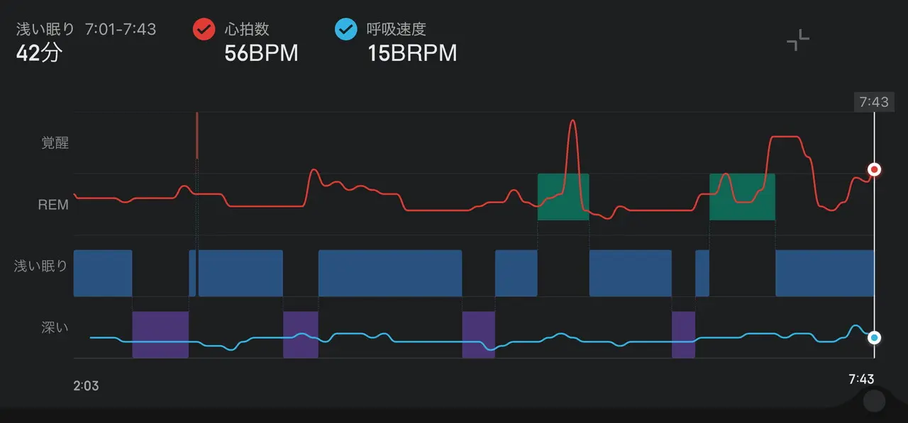 睡眠中もバンドが心拍数や呼吸速度を高精度に記録。レム睡眠・ノンレム睡眠の割合を把握することも可能です。