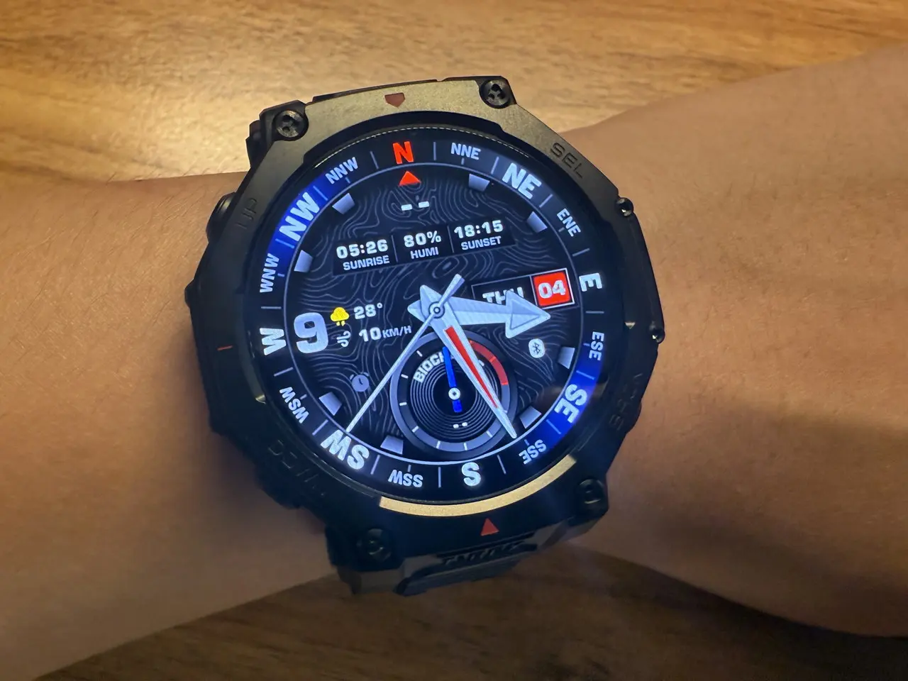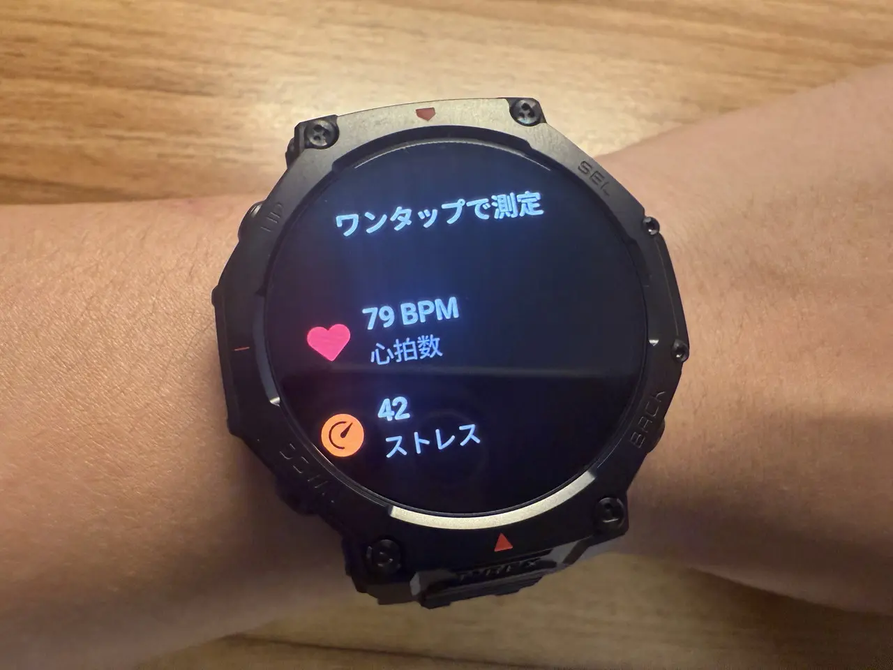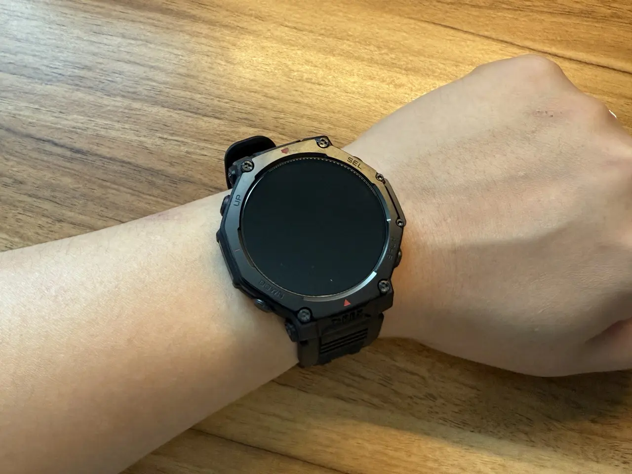 Amazfit T-Rex 3 Proは、タフネスウォッチらしい存在感のあるサイズ感ながら、実際に腕に装着してみると意外なほど快適です。重量はT-Rex 3より約7g重いものの、手首にずっしりと負担がかかるような印象はなく、長時間の着用でも気になりにくい仕上がりになっています。