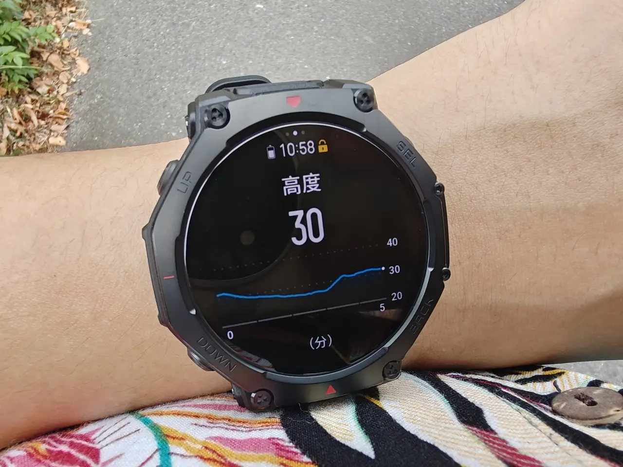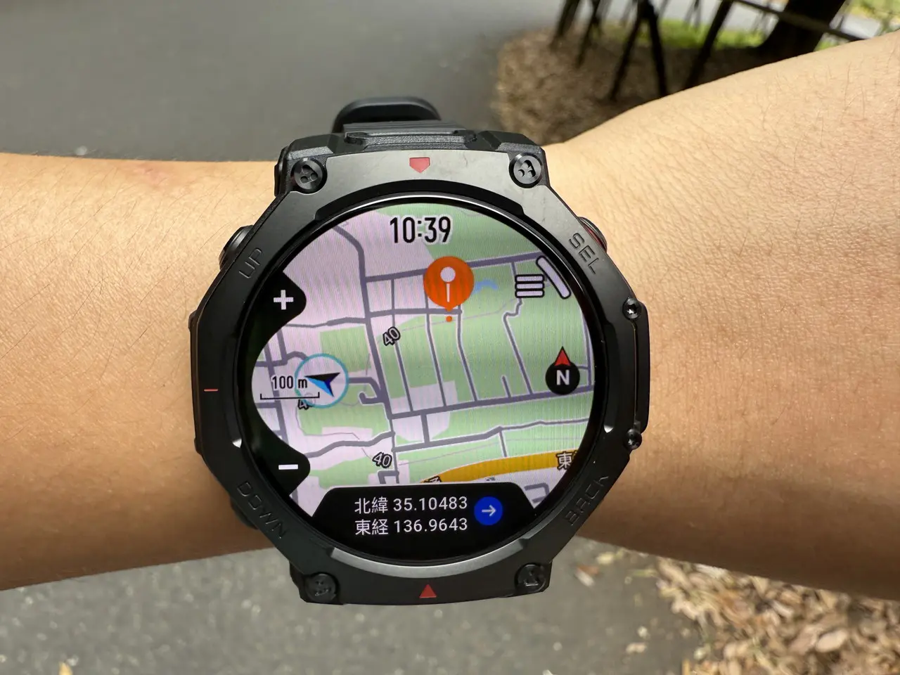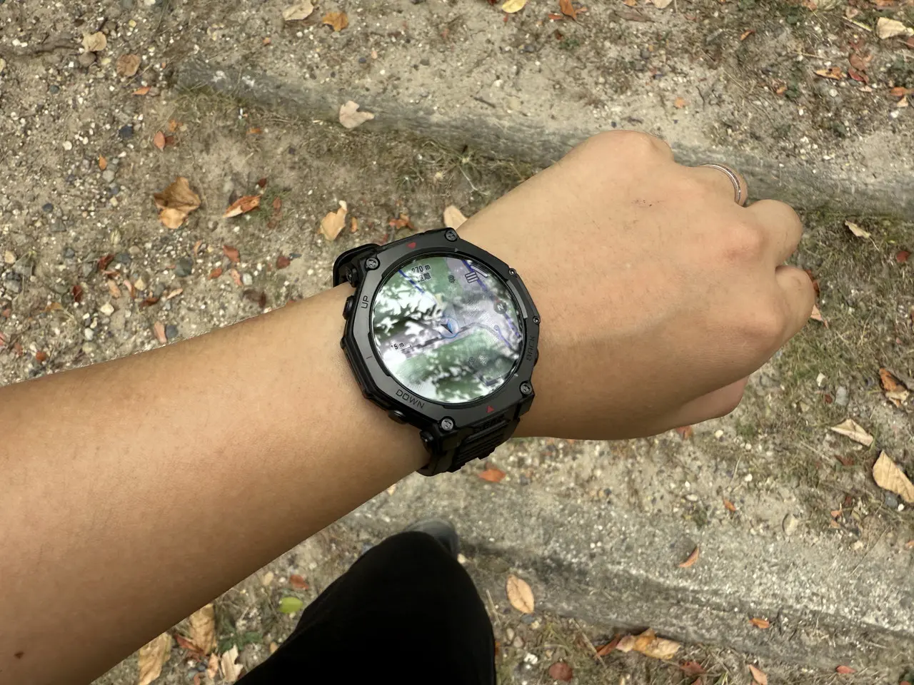 また、画面の明るさは最大3,000nitに対応しているため、日差しの強い山頂付近でも画面の見づらさを感じることはありませんでした。前モデル「Amazfit T-Rex 3」の輝度は最大2,000nitであったため、実際に見比べると、屋外での画面の視認性が圧倒的に向上しているのが分かります。
